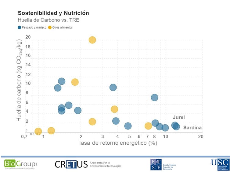 Ecoetiqueta de pescaenverde. Garantiza que posee una baja huella de carbono (kg de CO₂ equivalente/kg de producto) y una alta tasa de retorno energético (TRE, cociente entre la energía proteica que aporta y la energía necesaria para su captura y descarga en puerto).