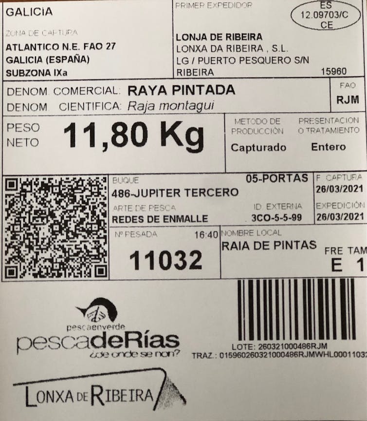 • Denominación. Se incluye el nombre científico, denominación comercial y el acrónimo establecido por la FAO para las diferentes especies. El ejemplo de etiqueta expuesto en la figura 2 corresponde al Raja montagui, esto es, la raya pintada, cuyo acrónimo de la FAO es RJM. Es común que también se detalle el nombre local, en este caso, su denominación en gallego: raia de pintas.