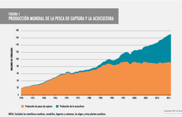 Ante la estabilidad de la producción de la pesca de captura desde finales de la década de 1980, la acuicultura ha sido la desencadenante del impresionante crecimiento continuo del suministro de pescado para el consumo humano. Entre 1961 y 2016, el aumento anual medio del consumo mundial de pescado comestible (3,2%) superó al crecimiento de la población (1,6%) y también al de la carne procedente de todos los animales terrestres juntos (2,8%). En términos per capita, el consumo de pescado comestible aumentó de 9,0 kg en 1961 a 20,2 kg en 2015, a una tasa media de aproximadamente un 1,5% al año. Las estimaciones preliminares relativas a los años 2016 y 2017 apuntan a un nuevo aumento hasta alcanzar unos 20,3 kg y 20,5 kg, respectivamente. El incremento del consumo se debe no solo al aumento de la producción, sino también a otros factores, entre ellos la reducción del despilfarro.